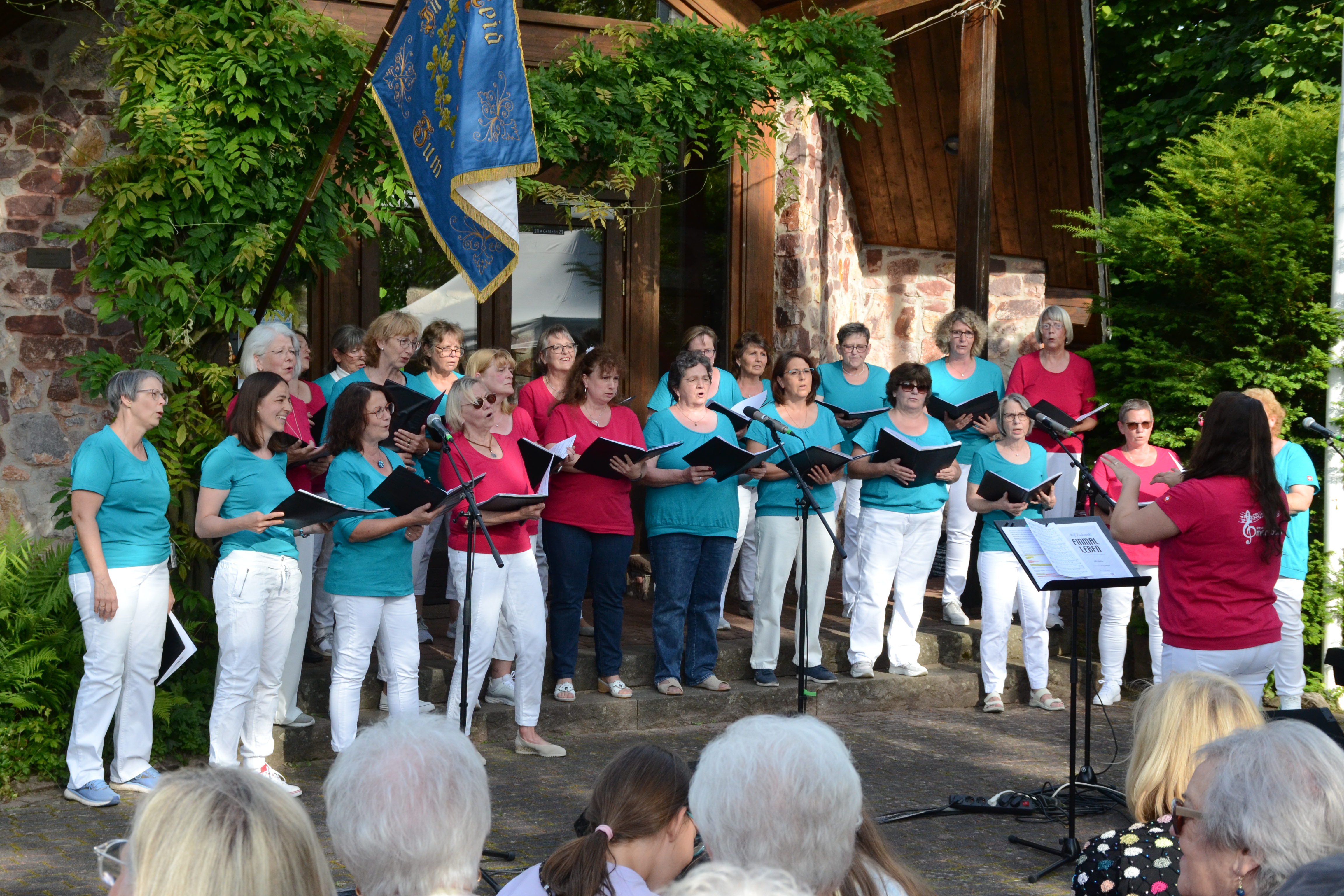 Der Zusammenhalt und das Durchhaltevermögen zeichnete den Frauenchor des Liederkranz 1910 Omersbach e.V. über das Bestehen von 25 Jahre hinweg aus. So formulierte es Petra Knipp in der szenischen Chronik beim Jubiläumssingen an der Omersbacher Marienkapelle. Seit 25 Jahren singen die Frauen jede Woche und erleben neben den Momenten, wenn der 3- oder sogar 4-stimmige Gesang schön klingt, Gemeinschaft und Freude. Im Jubiläumsjahr werden die Frauen auf eine besondere Probe gestellt, denn es ist schon einiges passiert. Der Chor feierte sich selbst bei einer rauschenden Party in der alten Schule, erkundete den Palmengarten in Frankfurt und trat bei einem Freundschaftssingen in Biebergemünd-Breitenborn auf. Am 8. Juni feierten die Sängerinnen nun an der Kapelle mit Gästen aus nah und fern. Bei herrlichem Wetter präsentierten sie unter der Leitung von Sabrina Lotz ihre schönsten aktuellsten Lieder wie „Regenbogenfarben“ von Kerstin Ott und „Can you feel the love tonight“ von Elton John. Dass sie ein internationales Repertoire haben, bewiesen sie mit einem französischen Lied aus dem Film „Die Kinder des Monsieur Mathieu“. Das Liedgut, das der Chor einstudierte, hat sich über die Zeit schon sehr gewandelt. Aber besonders wichtig ist den Frauen der Spaß beim gemeinsamen Musizieren, was sie beim nächsten Highlight am Samstag, 21.09. um 19.00 Uhr zeigen wollen. Ein Jubiläumskonzert muss schon sein und so haben die Omersbacher Frauen sich 2 Gastchöre in die Geiselbacher Pfarrkirche eingeladen. Mit dem gemischten Chor der Germania Huckelheim und dem Musicalensemble Songshine aus Pflaumheim gestalten sie den Abend. Unter dem Motto „Let us sing together!“ werden viele bekannte moderne Lieder aufgeführt und das Publikum bestens unterhalten.